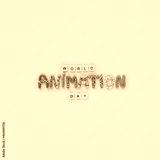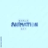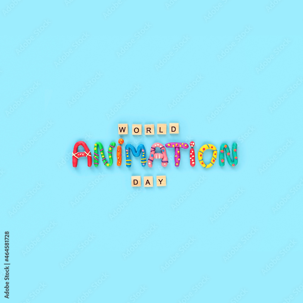 World animation day. wooden letters and funny colorful letters made of plasticine on blue background. 28 october holiday of international animation day, cute greeting card design