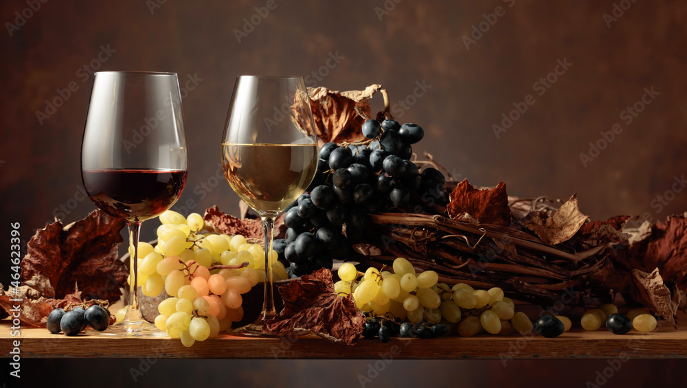 Glasses of white and red wine with bunches of grapes on wooden table.