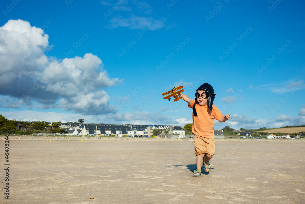 Boy with toy plane in aviation hat run on beach