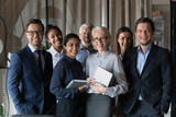 Human resource. Group portrait of smiling employees friendly team of diverse age race gender standing in office together. Successful motivated old young age multiethnic corporate staff look at camera
