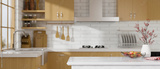 Marble kitchen counter island over blurred white and wooden kitchen room. 3d rendering