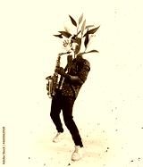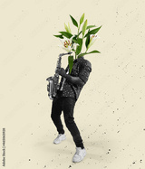 Contemporary art collage, modern design. Retro style. Young man, musician headed by blooming flowers. Surrealism