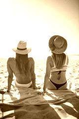 Back view of female sitting friends at beach. Two women in colorful swimsuits sitting near sea, looking at water. Party, outdoor activity, friendship concept