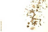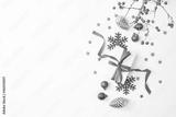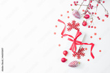 Flat lay frame with red berries, christmas red balls and gift box on a white background. Merry christmas card and copy space for your text