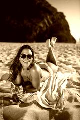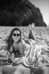 Lovely woman in sunglasses sunbathing at beach. Woman with glass with bright cold beverage. Lying on blanket, looking at camera. Party, outdoor activity, beverages concept