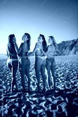 Back view of female friends at beach party. Women in colorful swimsuits, standing at beach, posing, looking at camera. Party, outdoor activity, friendship concept