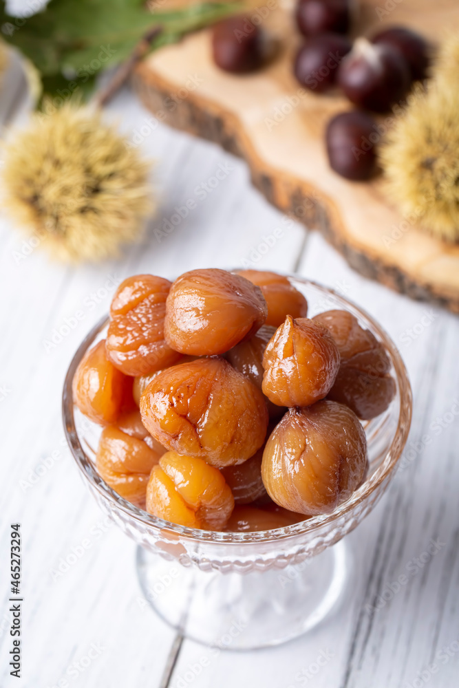 Chestnut dessert and chestnuts on a plate. Traditional delicious Turkish dessert; chestnut candies (Kestane Sekeri)