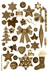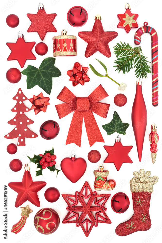 Red Christmas bauble tree decorations and ornaments with holly, ivy, fir and mistletoe on white background. Design element for the holiday season. Top view, flat lay.