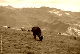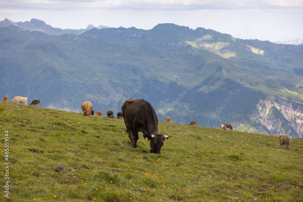 Beautiful cows are eating some grass. Wonderful cow is starring to the camera. Amazing hiking day in one of the most beautiful area in Switzerland called Pizol in the canton of Saint Gallen.