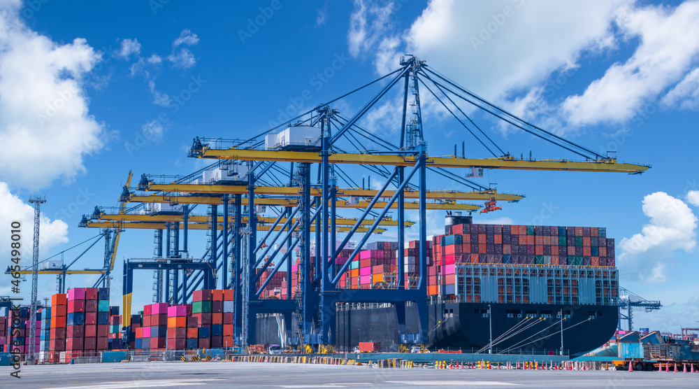 Cargo ship and truck at seaport waiting for container dock crane shipment harbour loading container boxes import and export commercial trade business logistic and transportation of international.