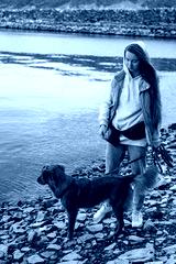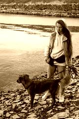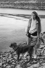 young woman and dog retriever walks on river shore at autumn season