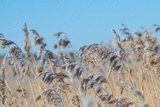Frozen reeds on extremely cold winter day on clear day in Espoo, Finland.