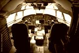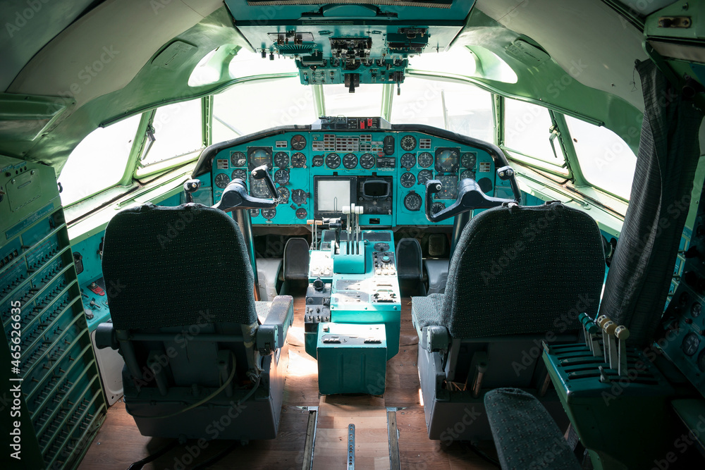 passenger airliner cabin. old, decommissioned Ukrainian plane. the plane is in the museum. cab with many buttons, toggles, controls and switches