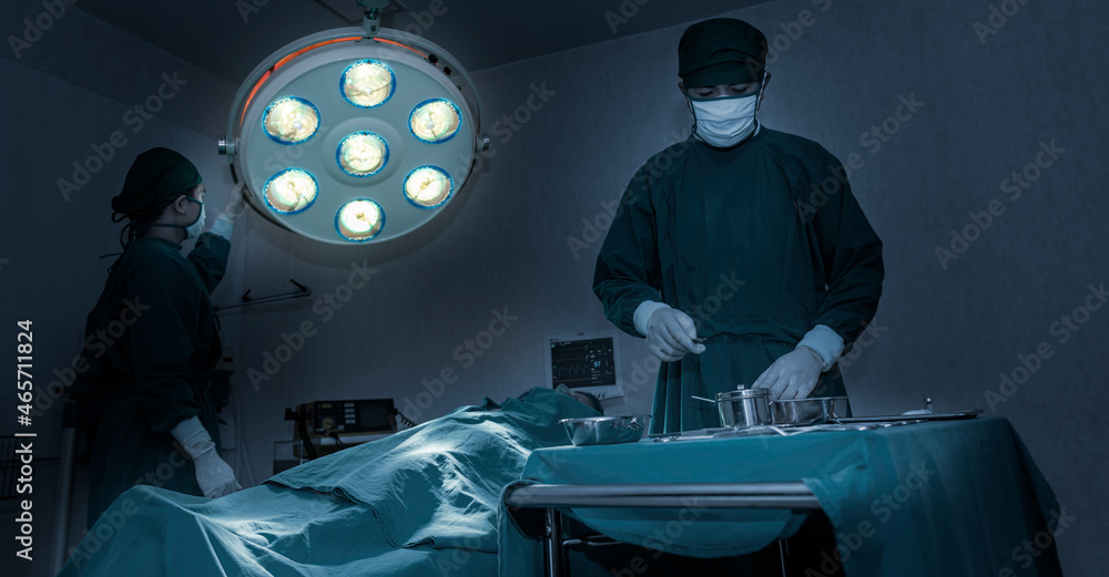 Team of professional doctors surgeons wearing safety uniform and surgical gloves preparing preferment operation in operating room for patient at hospital.