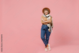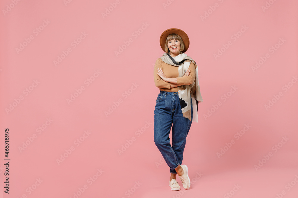 Full size body length traveler tourist vivid mature elderly senior lady woman 55 years old wear brown shirt hat scarf hold hands crossed isolated on plain pastel light pink background studio portrait
