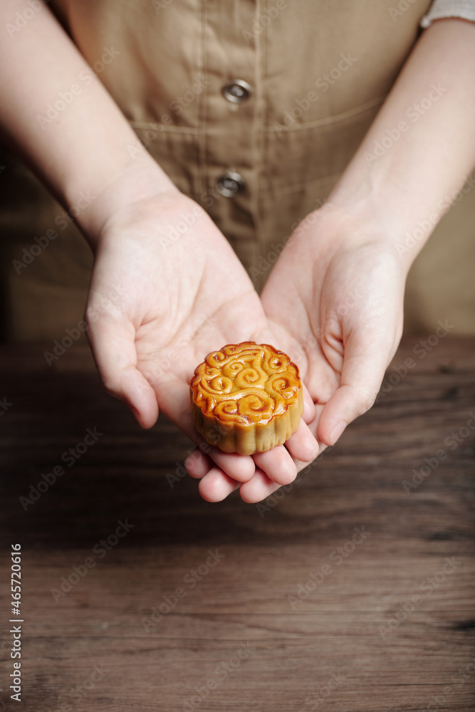 Hands of hospitable woman offering glazed mooncake as a present for mid autumn festival