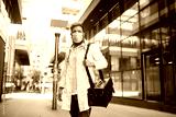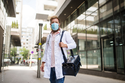 a young doctor with a mask on his face goes to the patient's home address