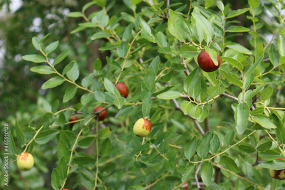 Close-up of Jujube tree with brown ripe fruits on branch. Ziziphus jujuba tree on autumn