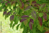 Close-up of Forsythia bush with green and red leaves in the garden on early autumn