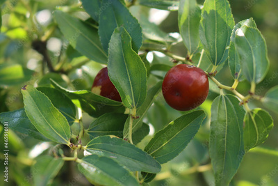 Close-up of Jujube tree with brown ripe fruits on branch. Ziziphus jujuba tree on autumn