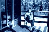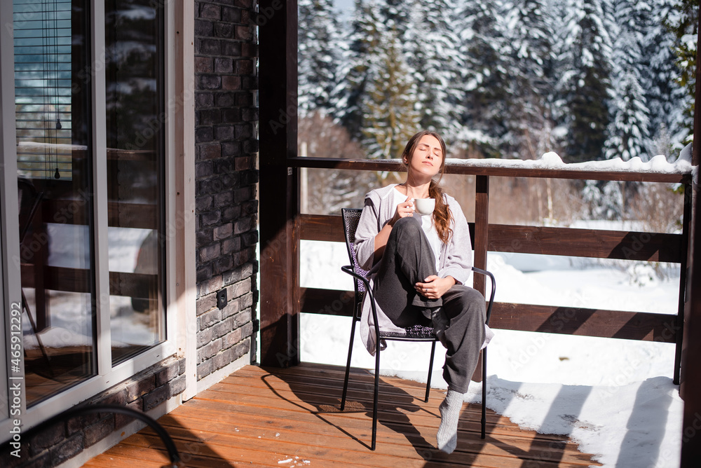 Woman sitting on terrace with coffee during winter morning