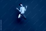 Full body photo of teen girl jump show v-sign wear pullover jeans sneakers isolated on brown color background