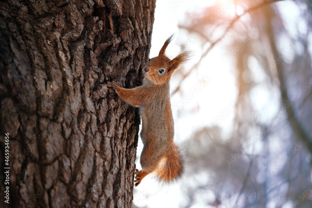 cute squirrel on tree, blurred natural background. Eurasian red squirrel (Sciurus vulgaris). save wild nature concept
