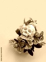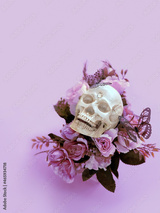 decorative skull, flowers and butterflies on abstract violet background. surreal creative image. atmosphere magic image. Halloween decor idea