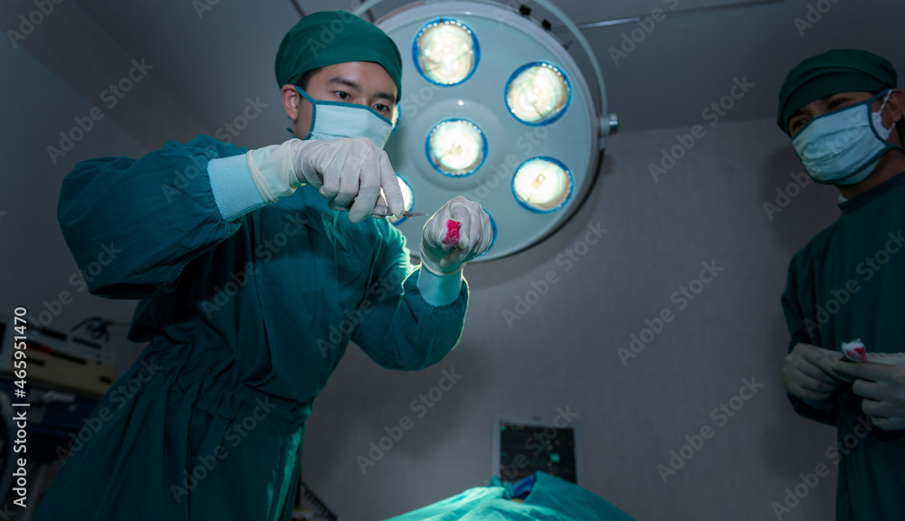 Team of professional doctors surgeons wearing safety uniform and surgical gloves preparing preferment operation in operating room for patient at hospital.