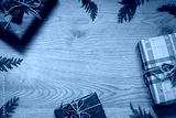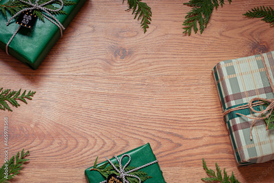 Christmas concept frame with gift boxes on the wooden background. Winter holiday greeting card. Copy space