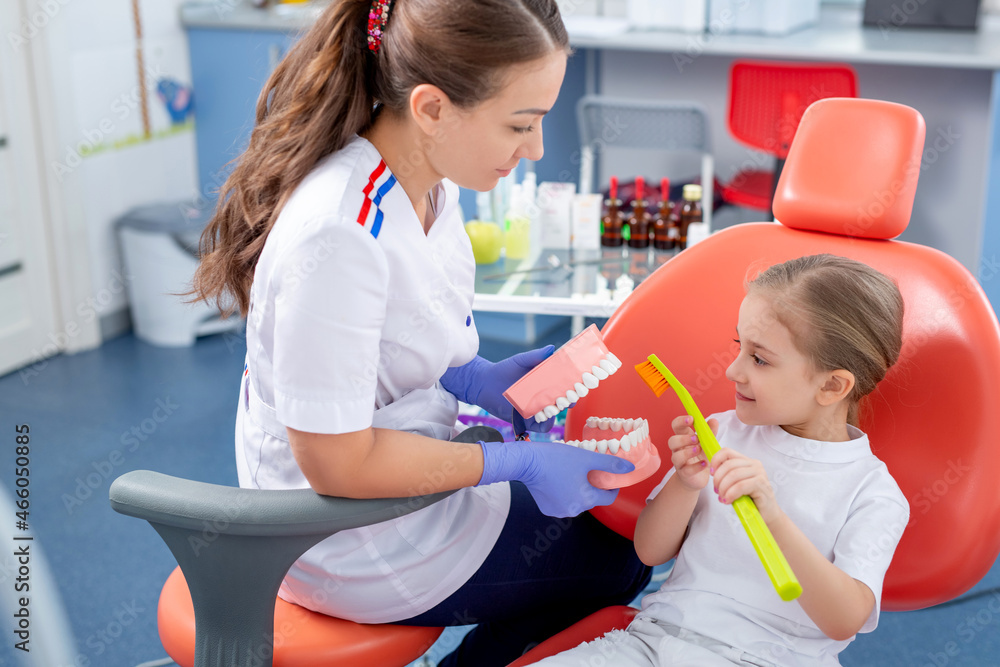 pediatric dentist shows how to properly brush a little girl's teeth. A beautiful girl is smiling in dentist's office. concept is a children's medical examination.