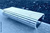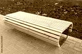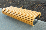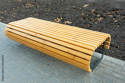 Modern comfortable wooden bench without back in new residential area. Landscaping of house territory