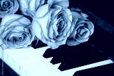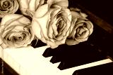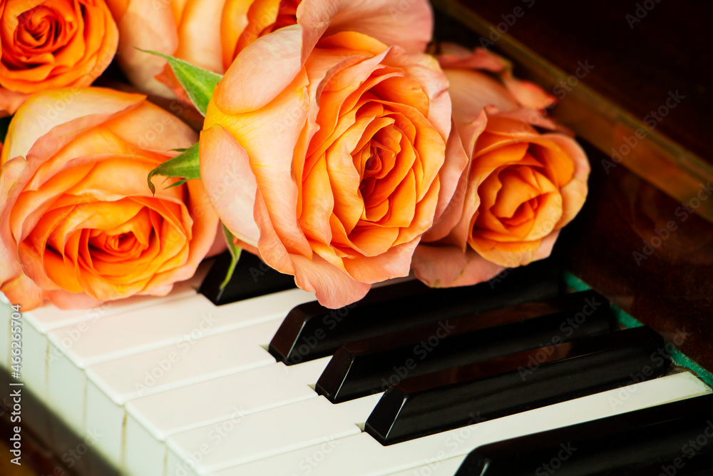 Bouquet of pink roses on the piano keyboard, romantic atmosphere. A gift from fans.