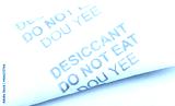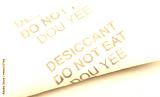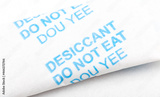 One single silica gel sachet desiccant package with "do not eat" text warning. Silicon dioxide parcel, condensation prevention, poisonous substance concept, object macro, extreme closeup, nobody