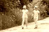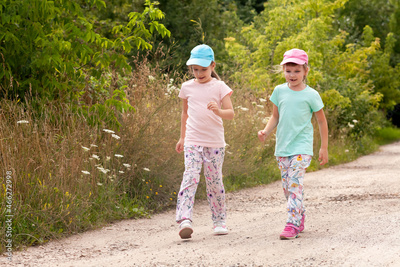 Two elementary school age girls wandering, children, sisters walking together through a country road, rural area. Taking a walk, kids strolling, togetherness and outdoors exploration concept, nature