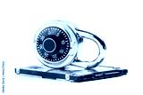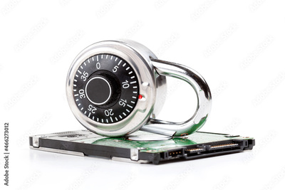 Locked HDD, hard drive password private data storage encryption abstract concept, nobody. Hard disk and a coded padlock isolated on white, cut out. Digital data safety measures, information security