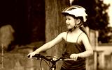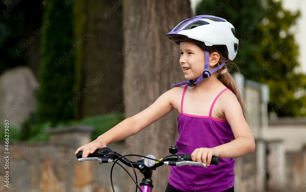 Happy cheerful elementary age child biking in a helmet, happy girl sitting on a bike smiling, hands on handle bars portrait, closeup. Sporty kid riding a bike, casual cycling. Young cyclist portrait