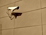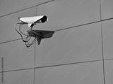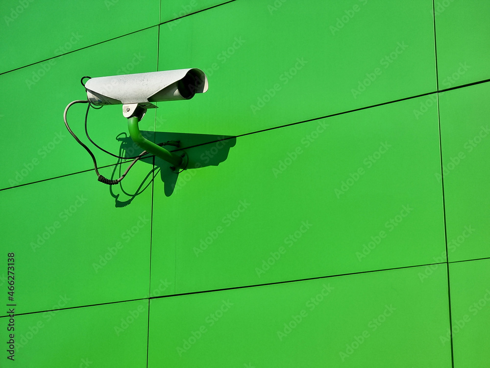 One single CCTV live video surveillance camera on a green wall, closeup, copy space. Urban safety and security equipment, city monitoring, lack of privacy issues simple abstract concept, nobody