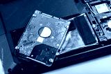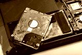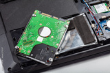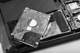 Single new 2.5 inch HDD, hard drive laying on top of a modern disassembled opened laptop, file storage. Hard disk replacement, digital data protection loss and recovery simple abstract concept, nobody