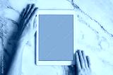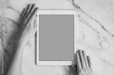 digital tablet computer in female hands with vertical green chroma key blank digital screen for mockup or space for text on a gray marble background. top view, flat lay