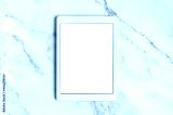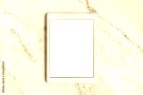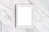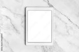 digital tablet computer with vertical white blank digital screen for mockup or space for text on a gray marble background. top view, flat lay