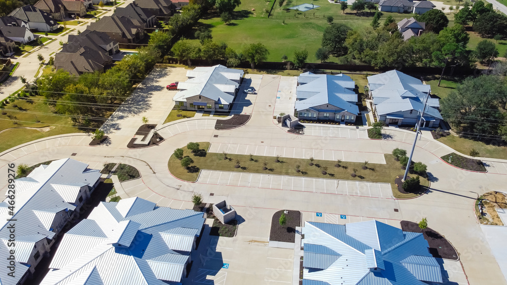 Aerial view business park with metal roof buildings near new development residential neighborhood in Grapevine, Texas, USA