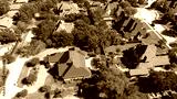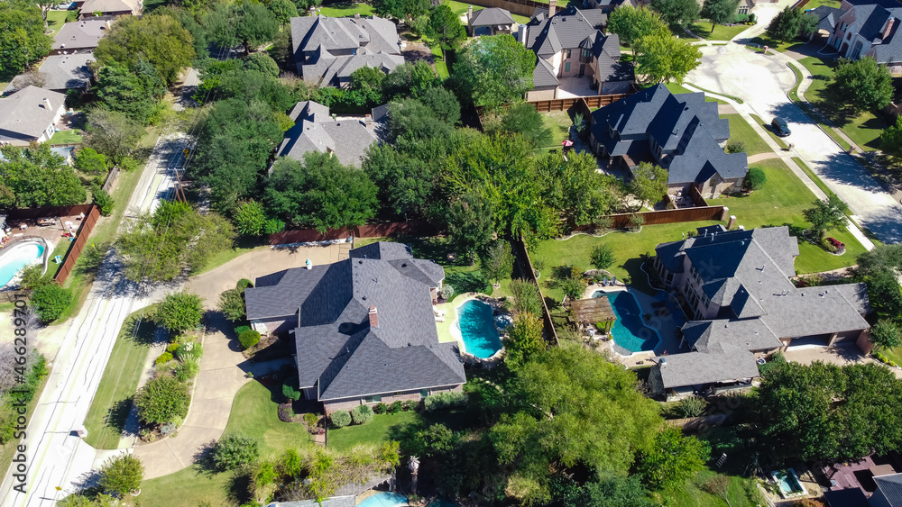Aerial view upscale neighborhood with expensive houses near service road with power lines in Grapevine, Texas, USA