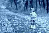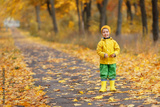 cheerful child boy in yellow raincoat and rubber boots in autumn park