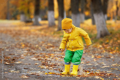 playful child boy with yellow raincoat jumping in puddle