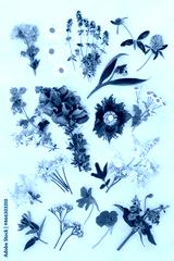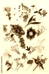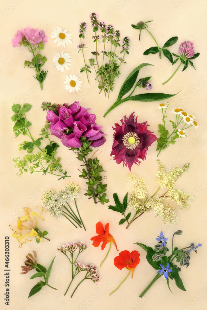 Herbs and flowers used in naturopathic plant based herbal medicine for natural herbal remedy treatments. Botanical nature study details. Top view, flat lay on cream background.