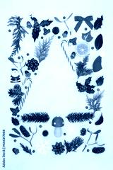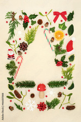 Abstract Christmas tree concept shape with natural European winter greenery, food, traditional decorations, symbols. Green nature eco composition for the Xmas and New Year on hemp paper background.