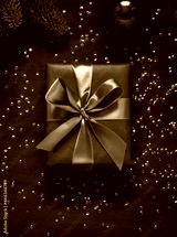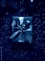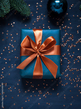 Christmas or New Year concept composition with a gift box and winter holidays decoration on the dark blue background. Top view.