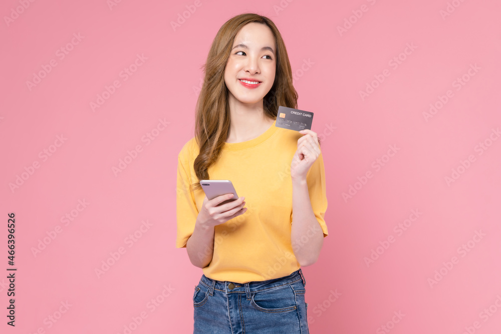 Cheerful beautiful Asian woman holding smartphone and mockup credit card on pink background.
