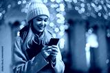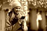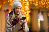 Happy beautiful woman girl using smart phone in the city with festive christmas fair background